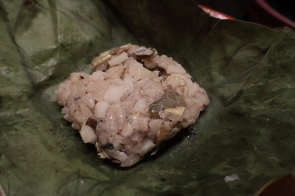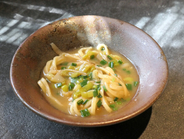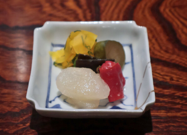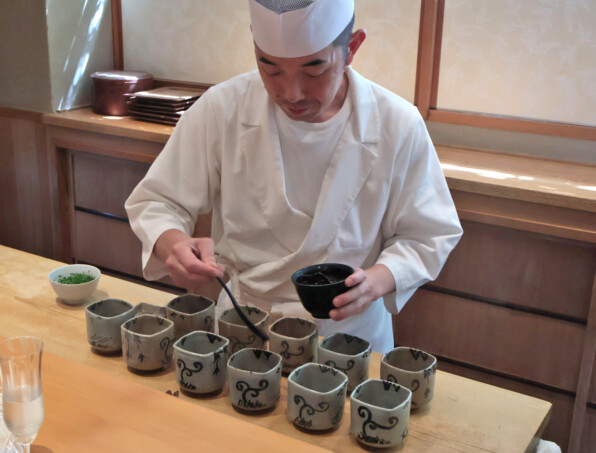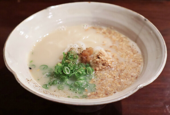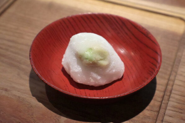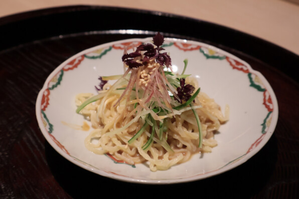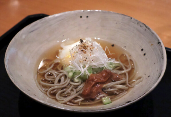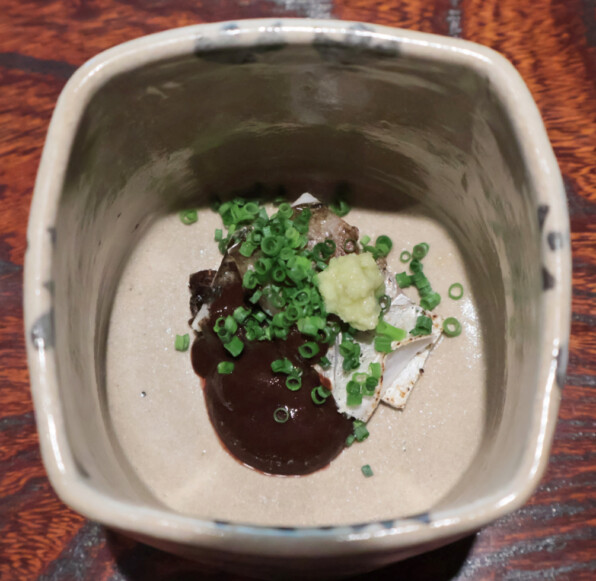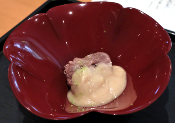 葛でとろみをつけられた赤紫蘇ペースト(酢、うす口、みりんと合わせてだしでのばした)とともに。安岡のねぎ。