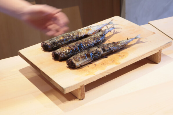 鱧に油をかけて、炭を当てて香ばしくしています。