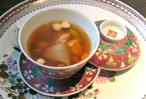 ひどくおいしい茶色まるはた、菊花、ひらひらしているのは白きくらげ。