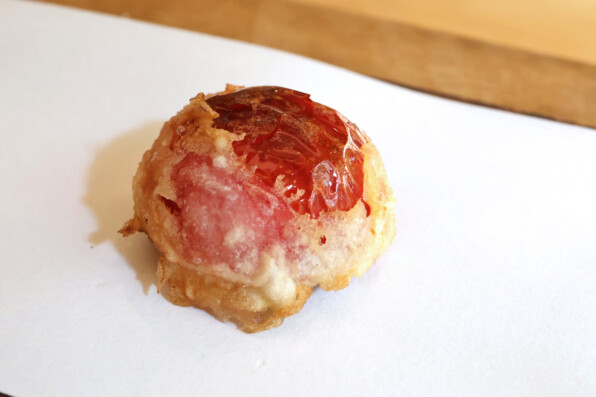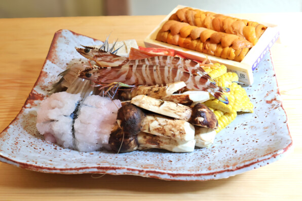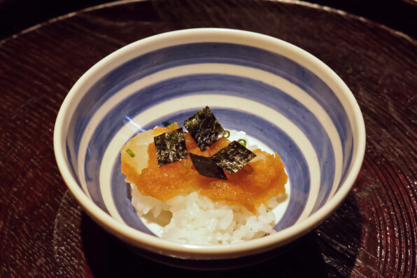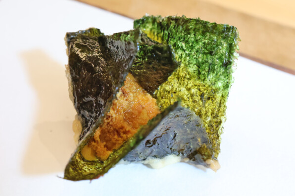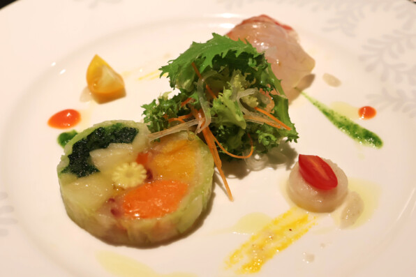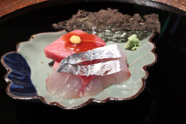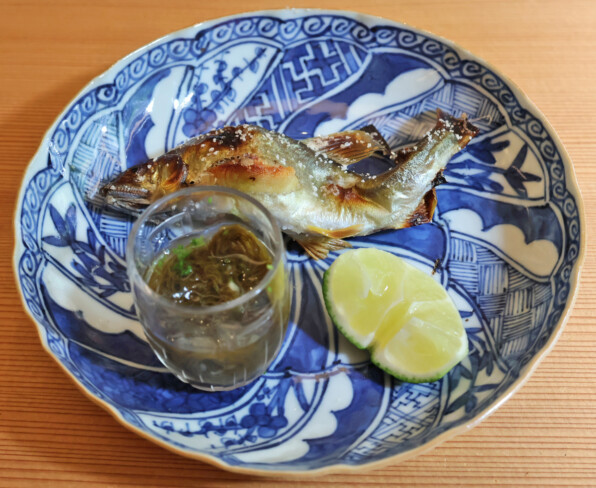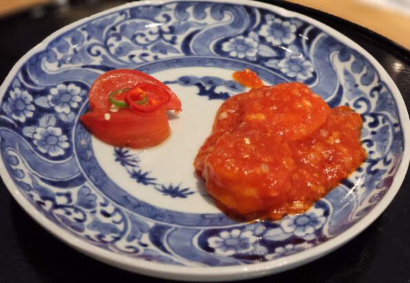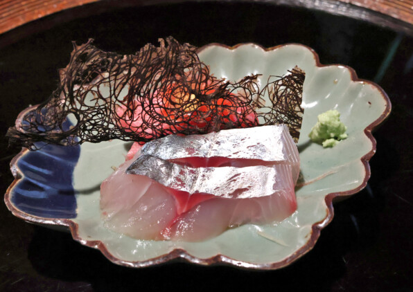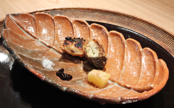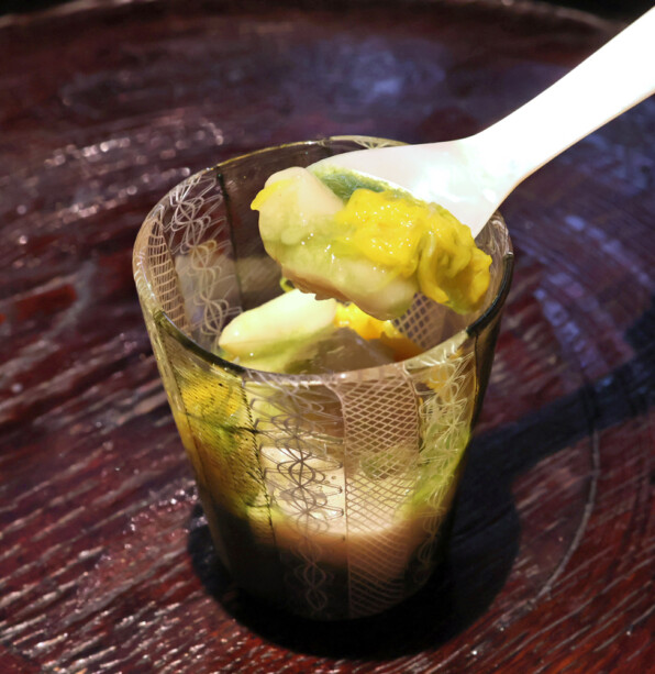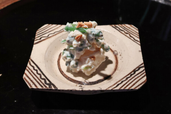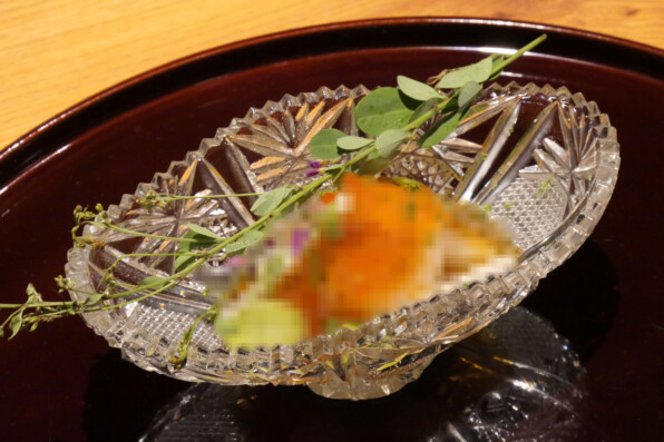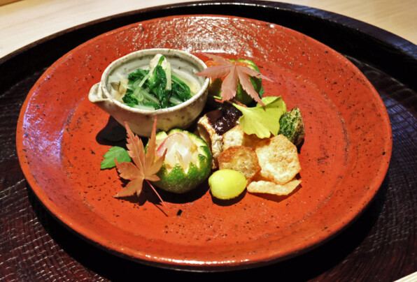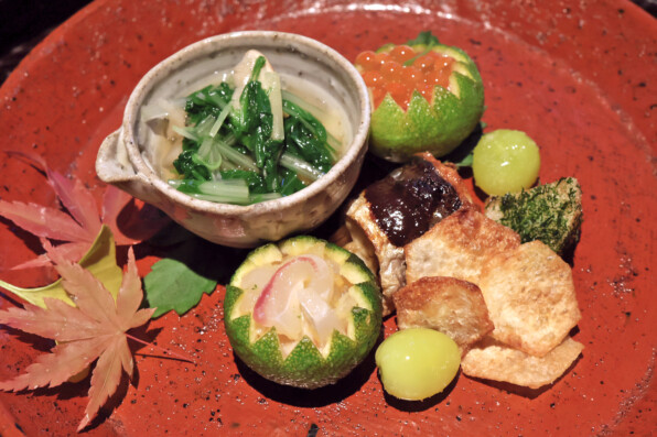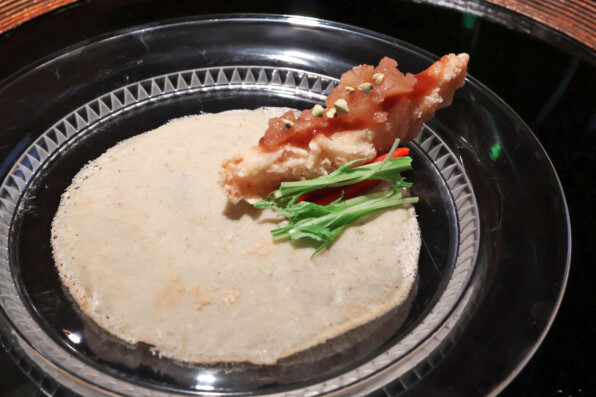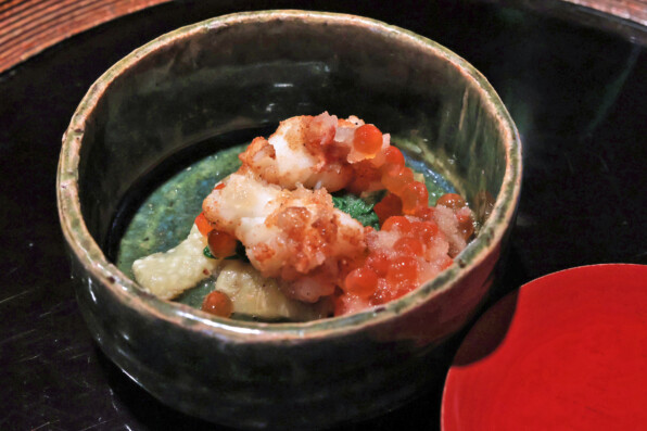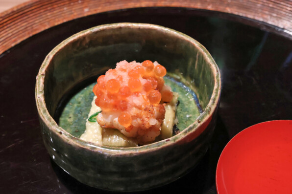 ●先付は伊勢海老揚げに、焼き茄子、いくらみぞれ和え。
