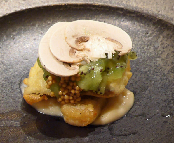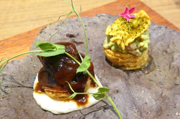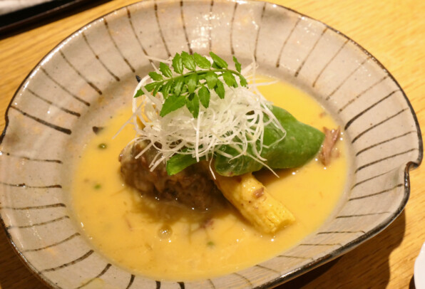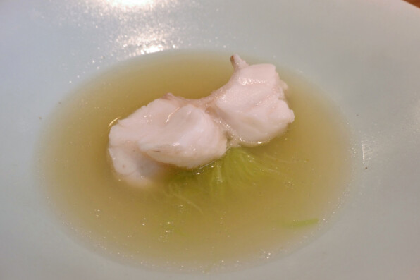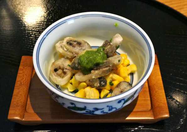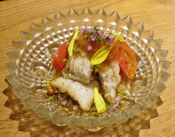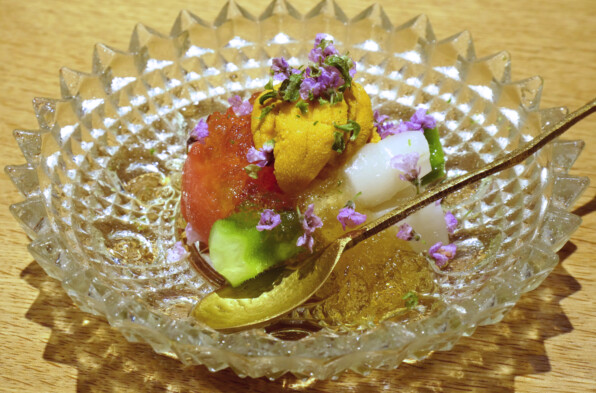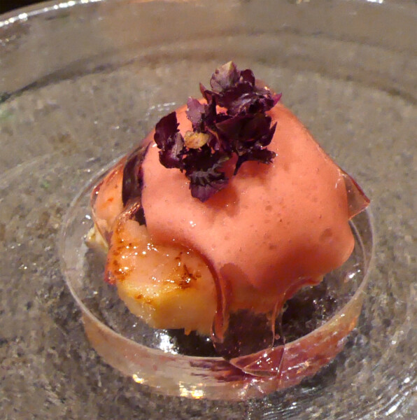 とり貝、焼き茄子ピュレ、トマトのジュレ。
