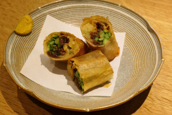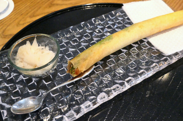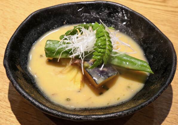 賀茂茄子揚げだし、焼き万願寺、葱。