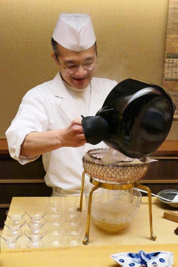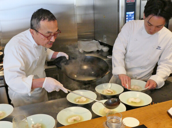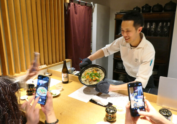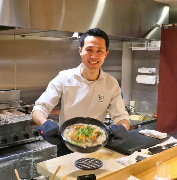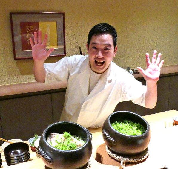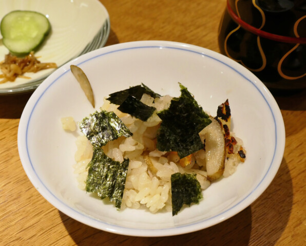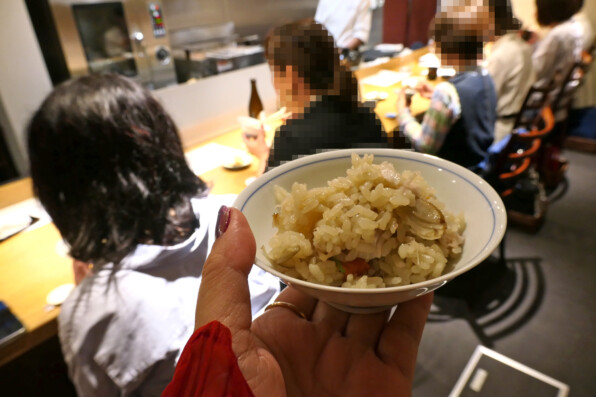 ●「威風堂々」と共に蓋を取られよそわれたご飯は、さざえと雲丹のご飯。同時に白ご飯も。