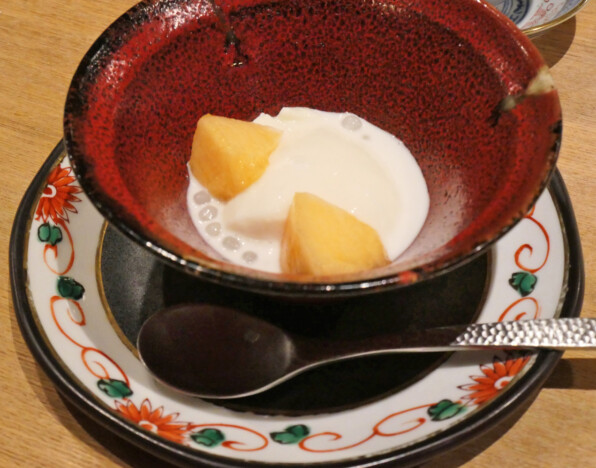 ●水物は、竹筒に、フルーツみつ豆 アマレットの香り。