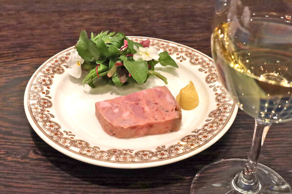 ●春の山野草以前に、今回びっくりの登場だったのがひと皿めのパテ・ドゥ・カンパーニュ。いつもの前菜盛り合わせ(明太子湯葉大葉巻き、イタリア豆腐・・・)に代わって用意された新メニューで、これがおいしかった(T_T)(T_T) 「ブション」の店主さんである松井知之さんにおみやげに持って行ってあげたいと思うくらい、本格的でワインにもよく合ったのでした<(_ _)><(_ _)>