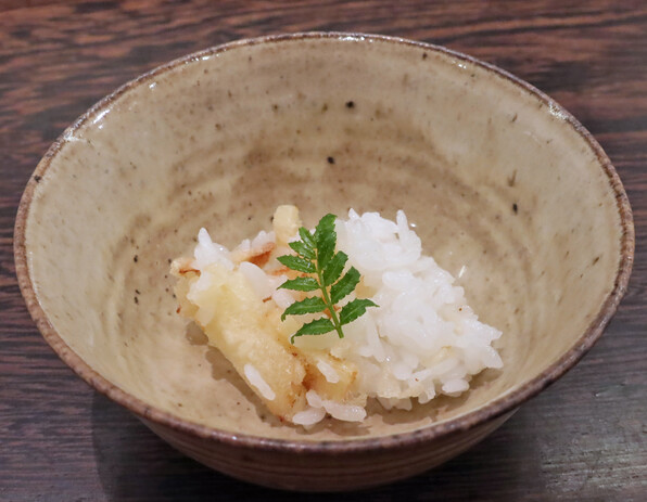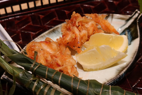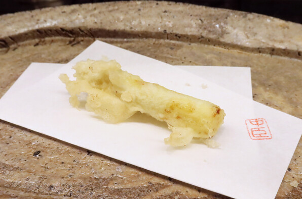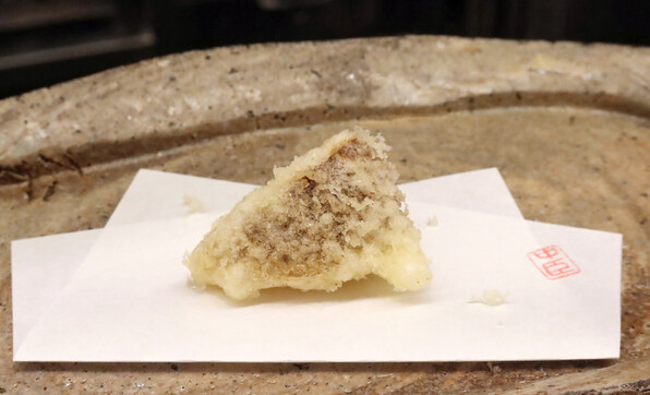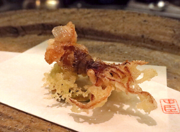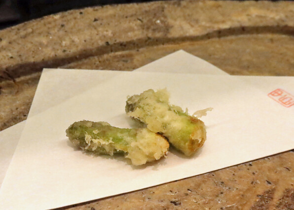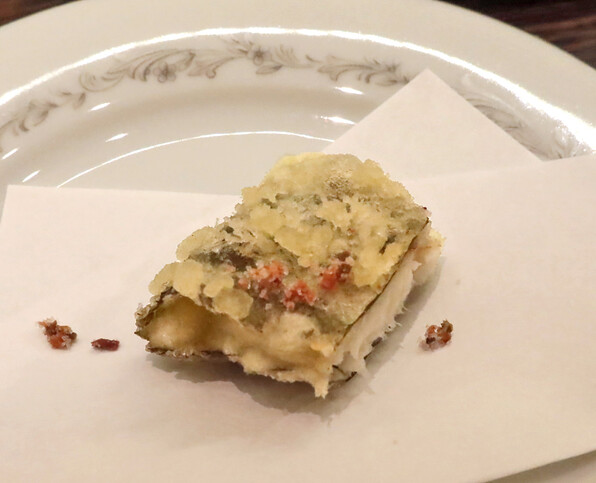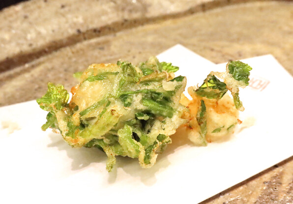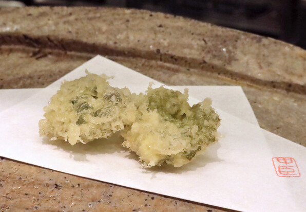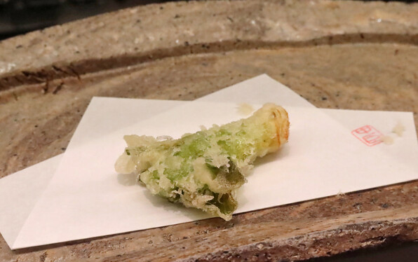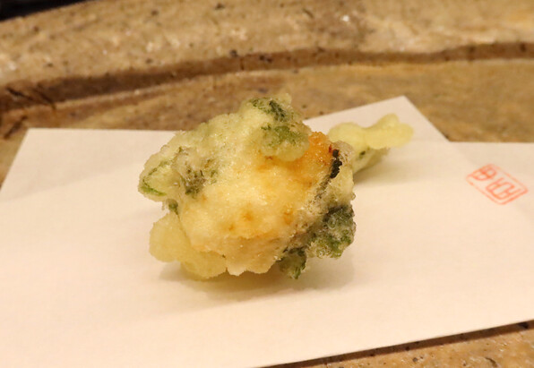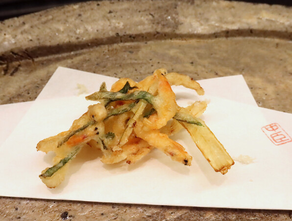 前半はたらの芽、ふきのとう、雪の下、甘草・・・と単品でそれ自体の香味を楽しませてくださいましたが、サラダをはさんで後半は、山野草(や野菜)と魚介を組み合わせたものを揚げるという技ありの供し方で驚かせてくださいました。