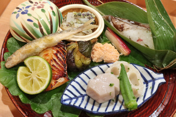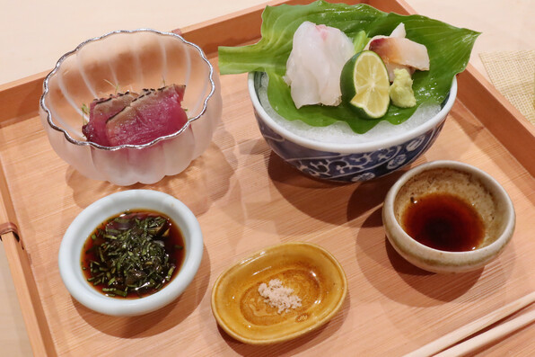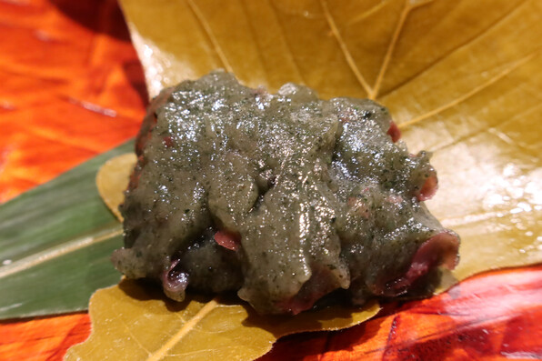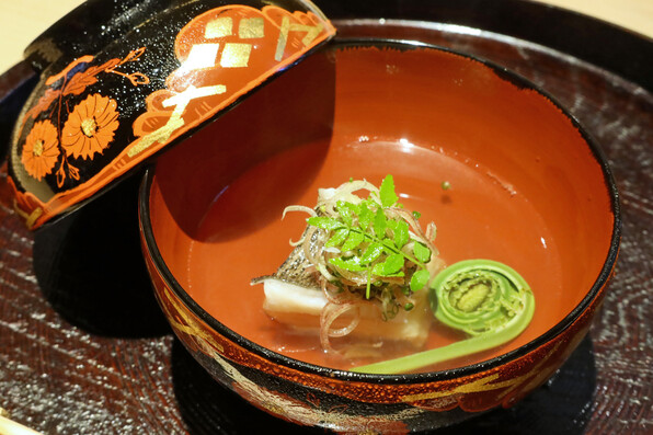 ●桜鯛(昆布締めして桜の葉で包んだ鯛の天ぷら、上に桜塩)