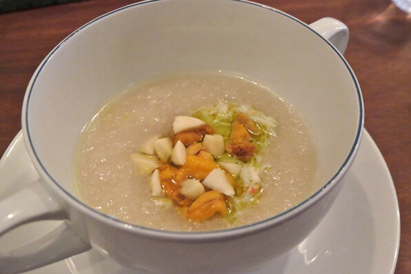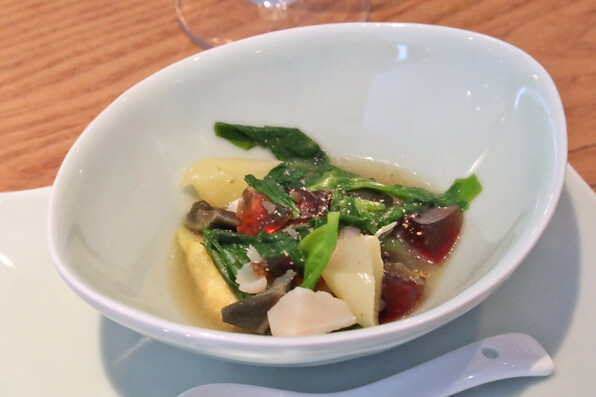 ●帆立貝のテリーヌに、筍、ほたるいか、はまぐりのスープ仕立て。