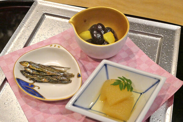 ●先付2 煮しめ れんこん、椎茸、小芋、金時人参、結び昆布、いんげん。