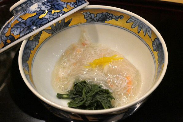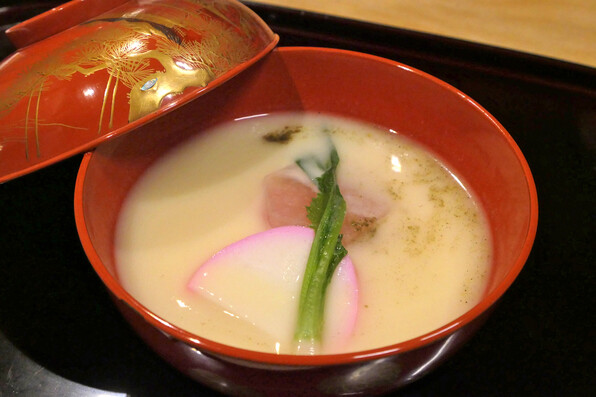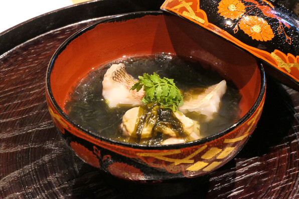 ●お椀は肉厚のちぢみほうれん草に甘鯛、氷蕪(雪に見立てて砕いた蕪)、あられ柚子。