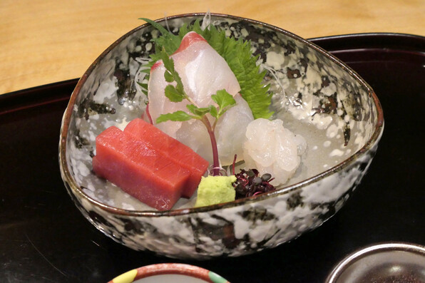 ●お造り1 赤貝、菜種、うるい、ラディッシュ。浜名湖の新海苔の醤油風味のジュレ。