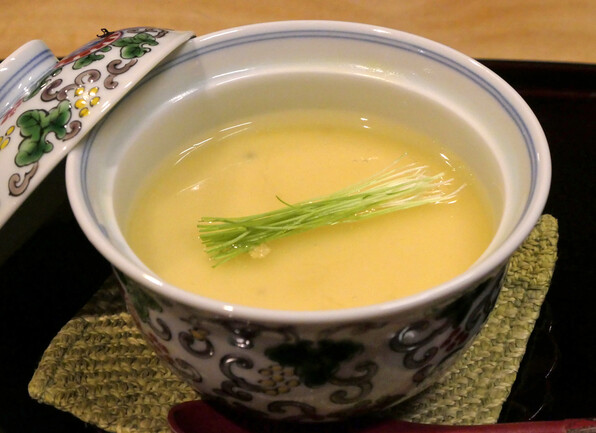 ●先付1 すっぽん豆腐 胡麻豆腐にすっぽん入り。すっぽんだしのあん。九条ねぎ、生姜。
