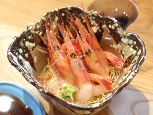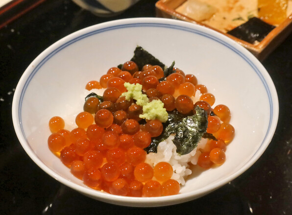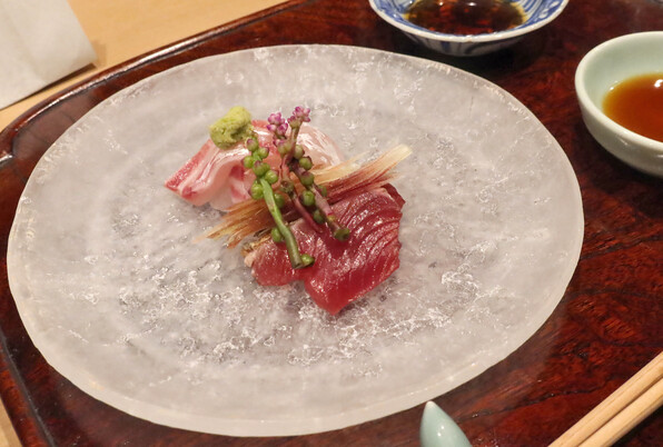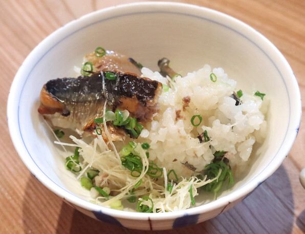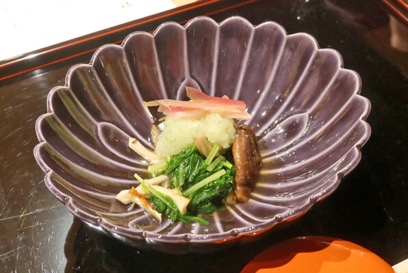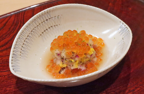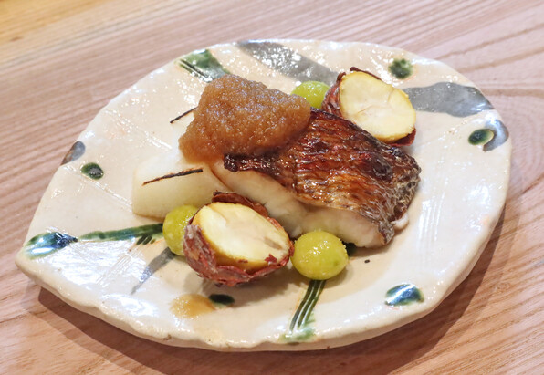 ●かます焼いたのだけでおいしいのに、みぞれ酢をかけてあって美味、さらに上からいくらで贅沢感がありました。菊花、柚子が色と香りを添えました。