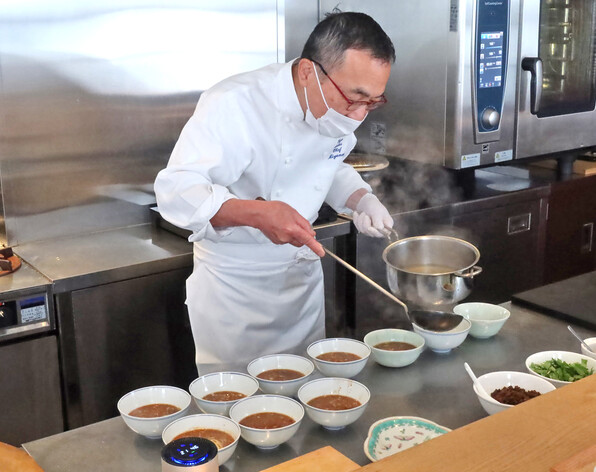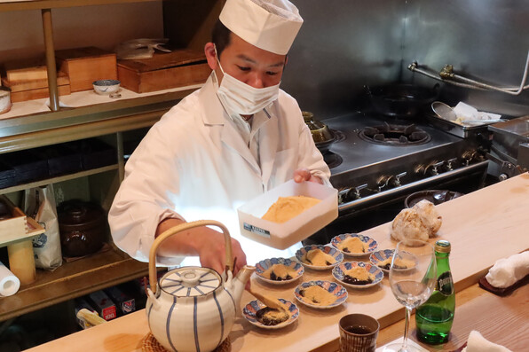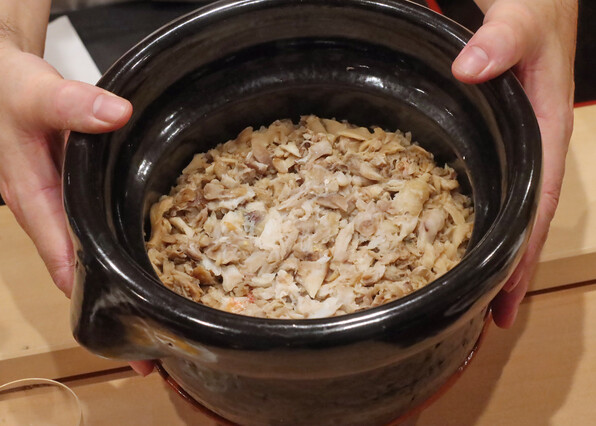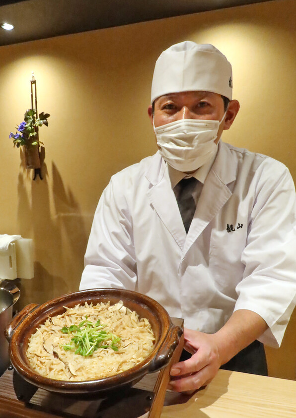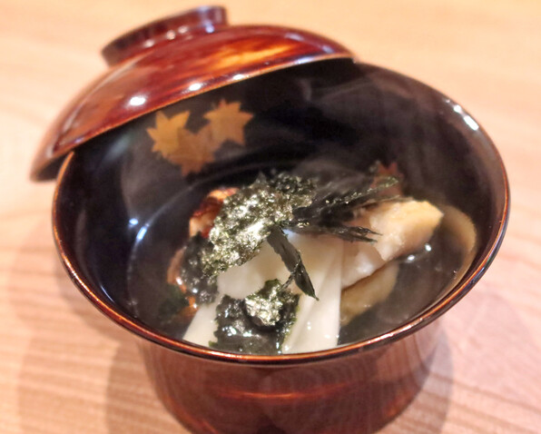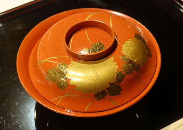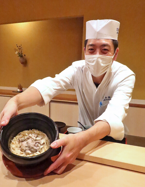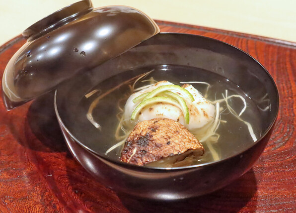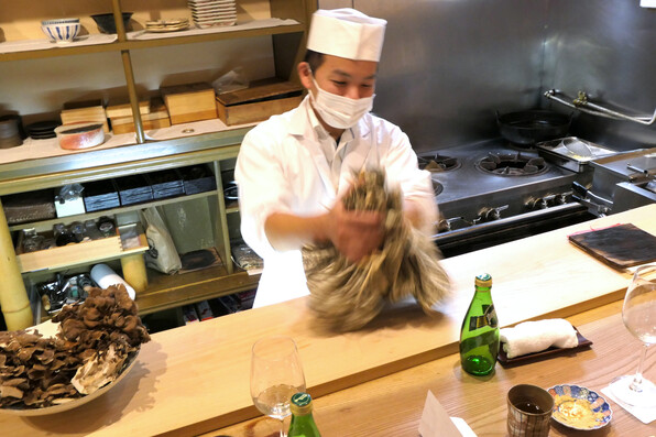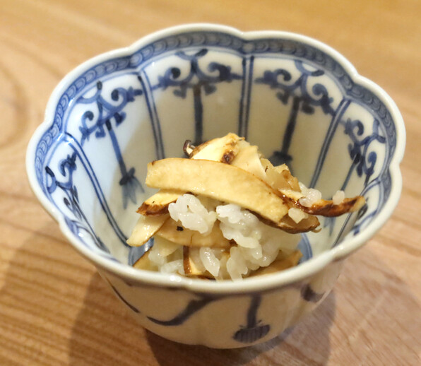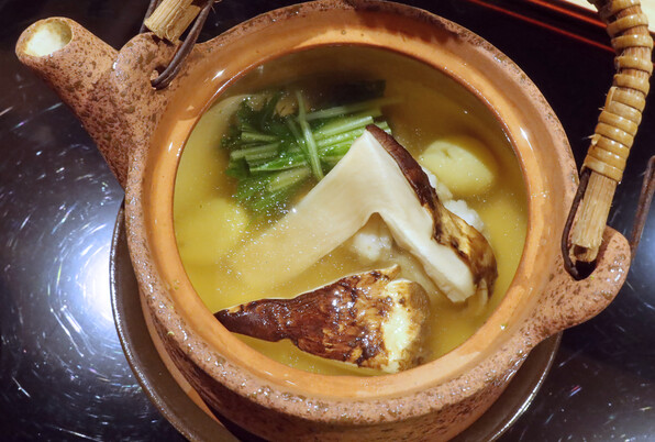 松茸の傘の部分は炭焼き、軸の部分はごく細く裂かれており、生のままお椀に入れたということです。吸い地を注ぐことで火を入れたということ。