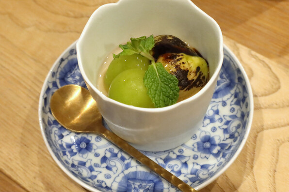 ●いちじくのブランマンジェは、いちじくの葉で香り付けをしたということ。蒸したいちじくから出た果汁をまたかけてあると。バルサミコ。シャインマスカットと。
