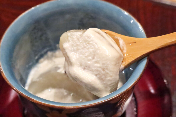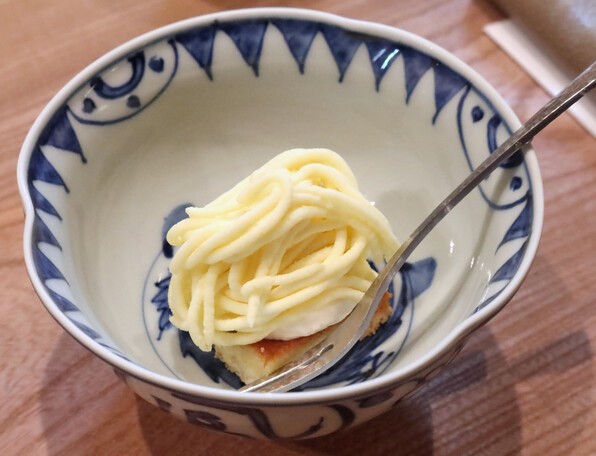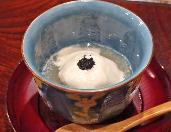 ●これがまたすごかった・・・青森からの蕪に、湯葉ではない、くるみのペーストです。焼いたら香り強すぎたとかで、生のくるみペーストということ。黒いのは油煮にした香茸ということで、トリュフオイルのような感じで使われていると。(ほんとすごい芳香でした。)くるみペーストは途中からはスープに溶いてくるみスープにしてねということ。蕪がこんなに旨いかくるみこんなに偉いか香茸こんなに香るかと、瞠目の思いでいただきました。