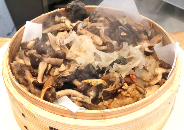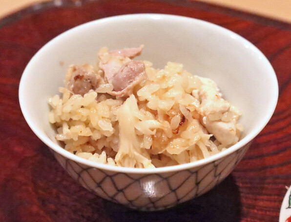 ●ご飯プレゼン、これはわたしが後から出かけた時の鶏肉ご飯で、肉質柔らかな雌の鶏使いましたとのこと。(大和肉鶏。)白舞茸と。