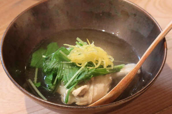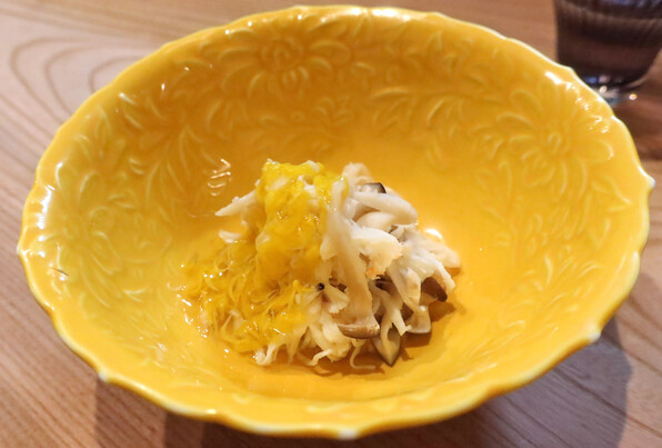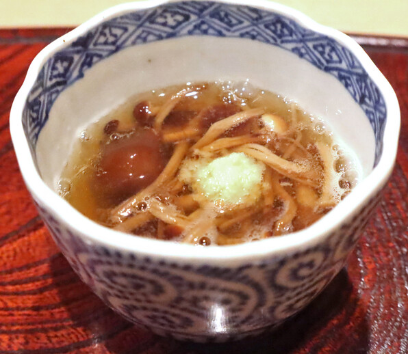 なめこ茸と柿の木茸。とろみは自然のものということ。照明のせいで緑のわさびに見えますが、生姜です。