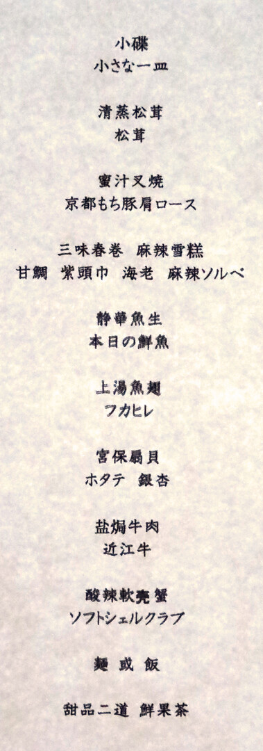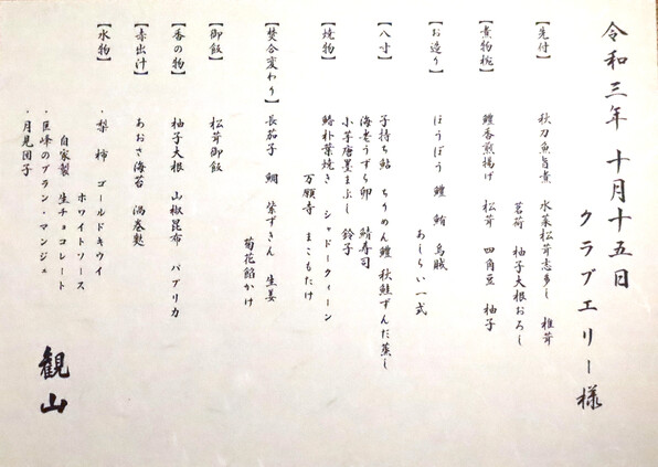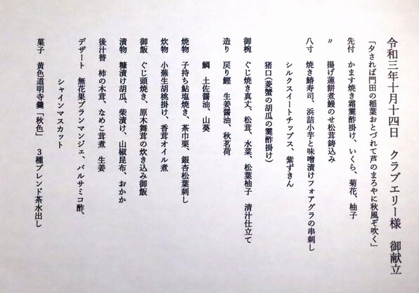 ●10月14日に3室とも満席でクラブエリー、その2日後に改めて、わたしも同じ献立をいただきに出かけました。