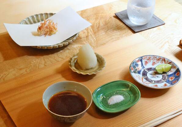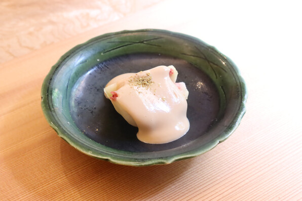 ●帆立のポーチ、帆立のフレッシュさを生かしており、そこにカラマンシー(柑橘)ぽん酢です。おだしを少し合わせてあり、なごめる味。いくらに大根で紅白おめでたいですという作り。かわいい、きれい(^o^)