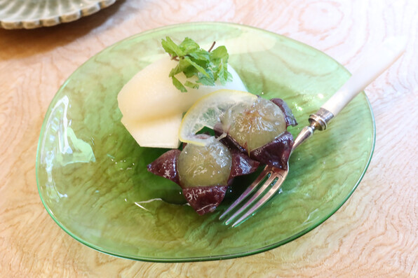 ベーコンの塩気とコンポートした洋梨の甘さがよいコントラストをなしています。