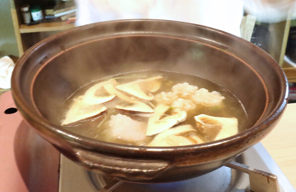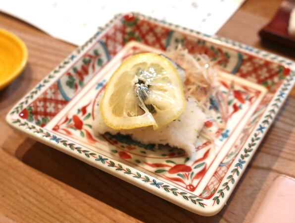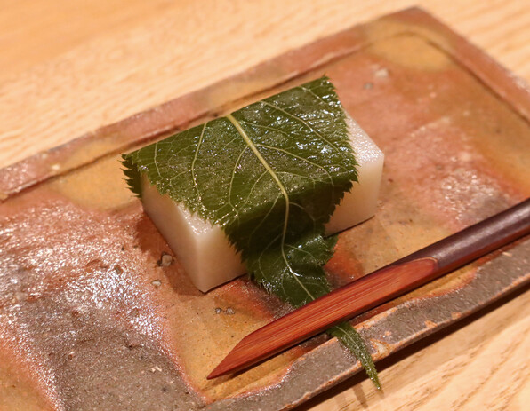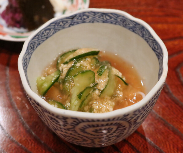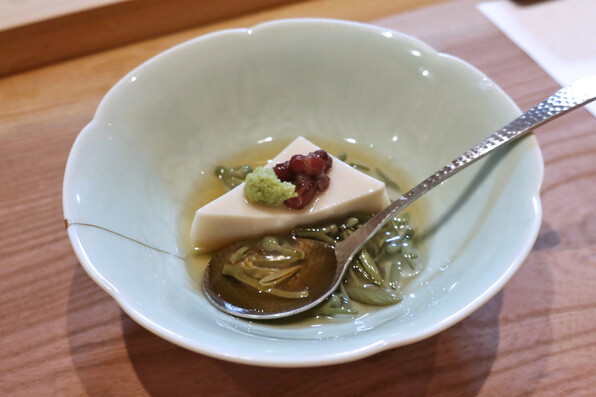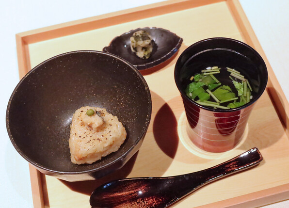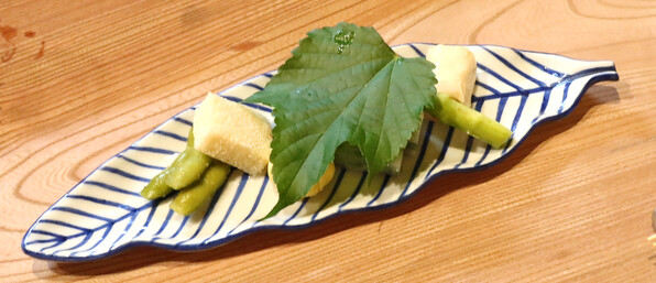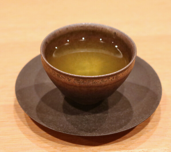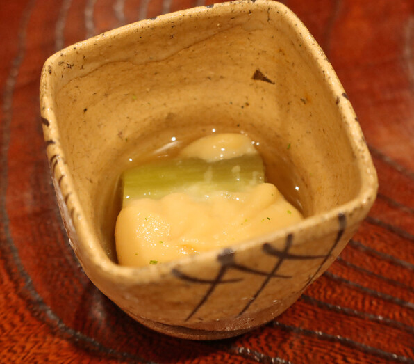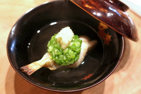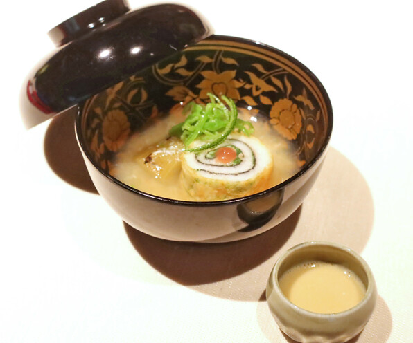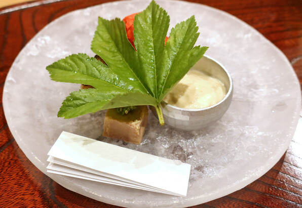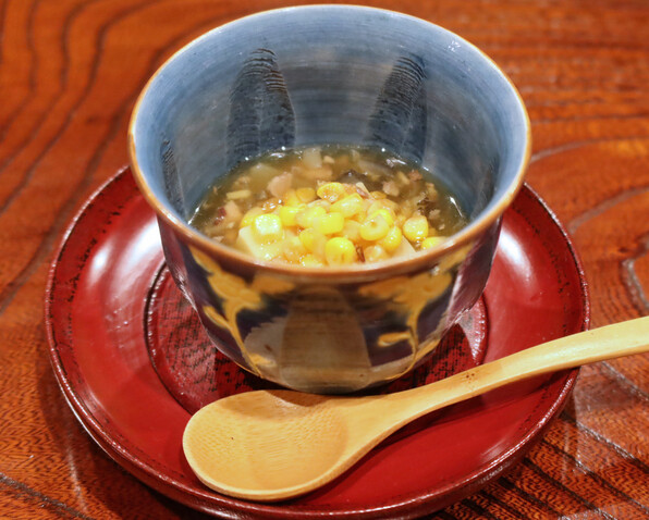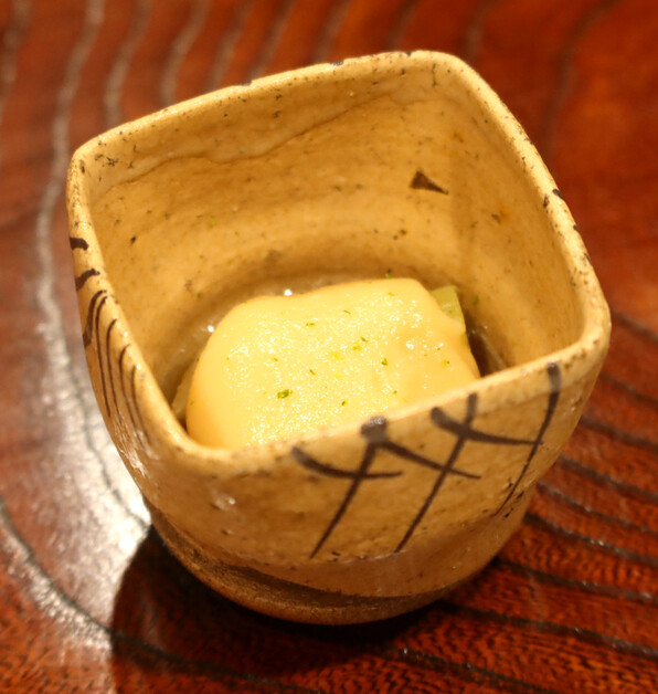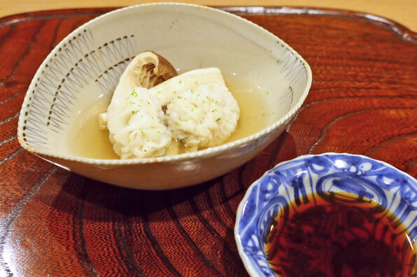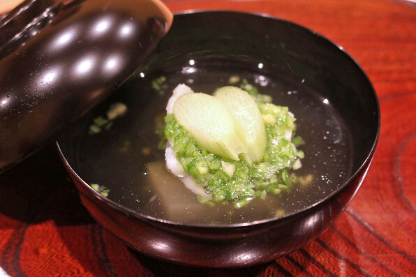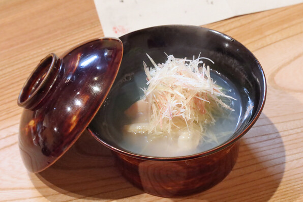 ●お椀は、茂魚(あこう)酒蒸し、冬瓜、たたきおくら、蓮芋。梅干し風味のすまし汁仕立てで、夏にふさわしい風味でした。