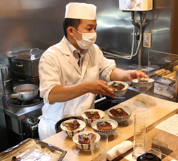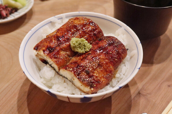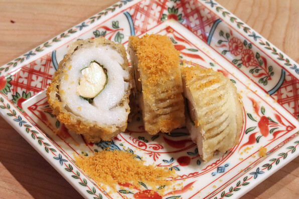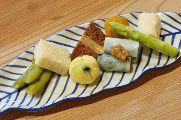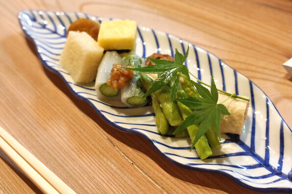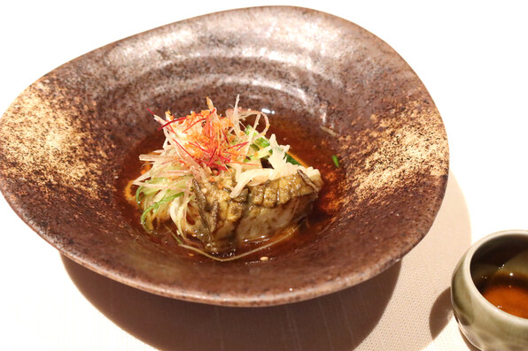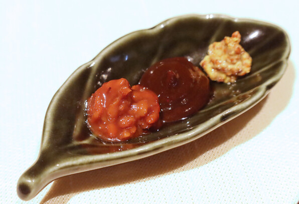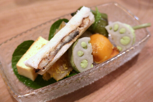 煮鰻寿司、酢取り茗荷、フォアグラ味噌漬け。