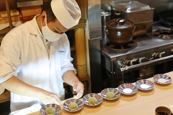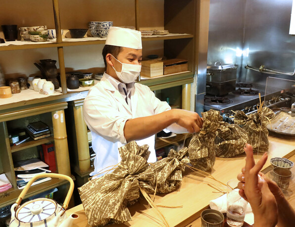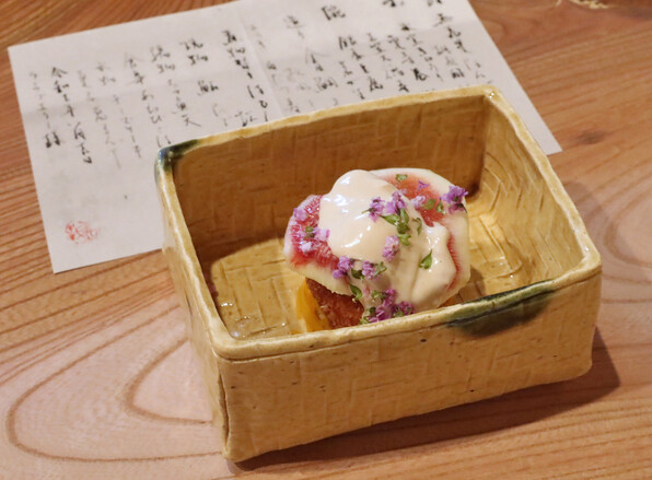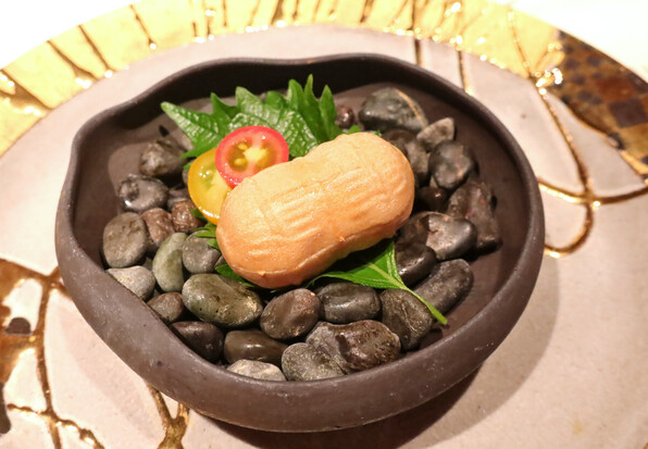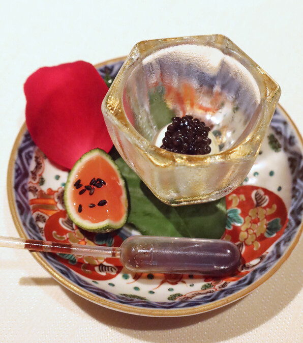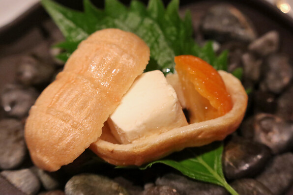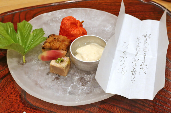 器の中は白ずいきの胡麻だれかけ、鬼灯(ほおずき)の中は蛸の子を炊いたもので柚子の香り。