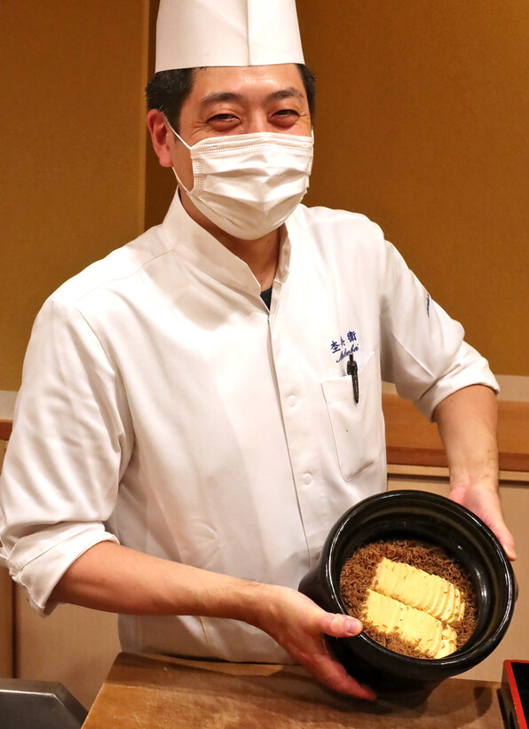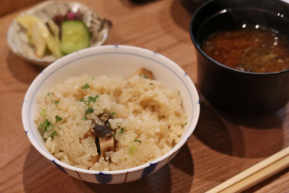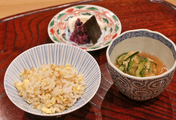 ●くずされ混ぜ込まれただし巻きご飯、おじゃこ入り。添えられたお汁が、