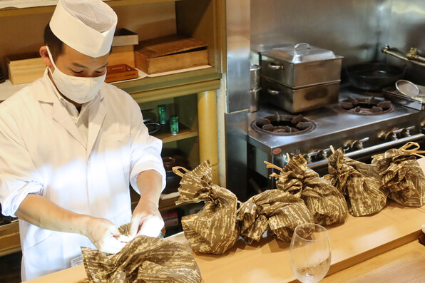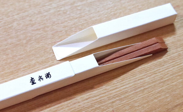 かりん材のお箸は、食事が終わったら先を拭いて(ちゃんと専用のお手拭きのような「お箸拭き」が配布されます)、箱に収めておみやげとして持ち帰れるのです。