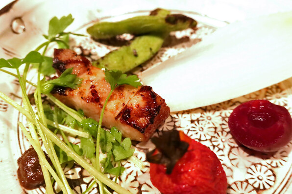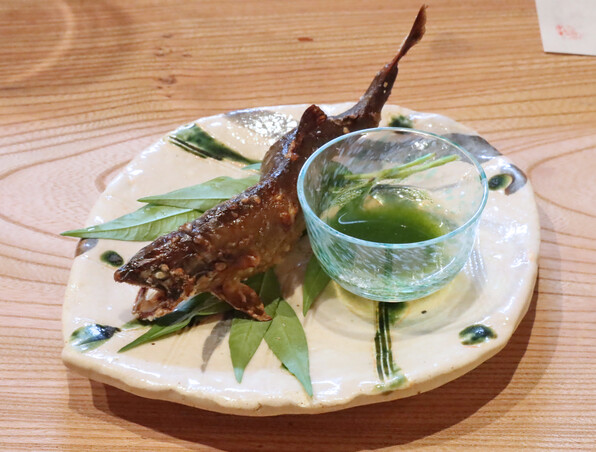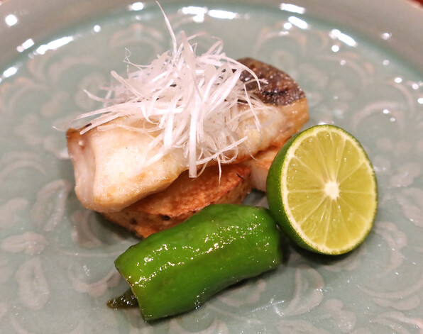 ●焼き物はまながつおです。ふんわりと、理想的な火の入り加減です。下に長芋をしゃきっと焼いたのが仕込まれていました。鷹峯とうがらしと。