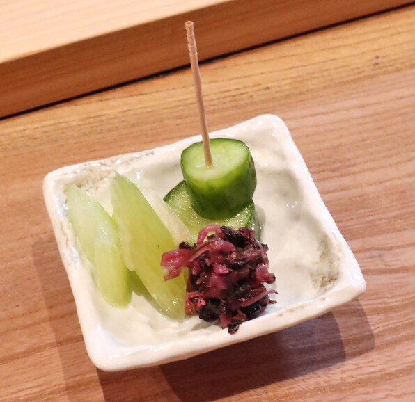 ●止椀がわり、ただものではない冷たい仕立てで、魚素麺に、まさかのトマトジュレをかけたもの\(^o^)/旨味たっぷりです。そこにぬか漬けきゅうり\(^o^)/\(^o^)/胡麻たっぷり。