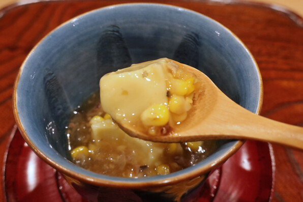 ●これもおいしかった(T_T)とうもろこし豆腐に粒粒とうもろこし。あんはすっぽんだしで作られたもの。生姜風味で、やみつき旨い旨い旨い(*_*)(*_*)