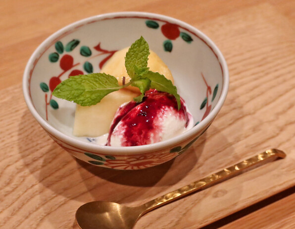 ●アヴァンデセールという感じで、ヨーグルトアイスクリームにブルーベリーソース。奥に白桃。ミントの葉。