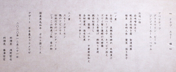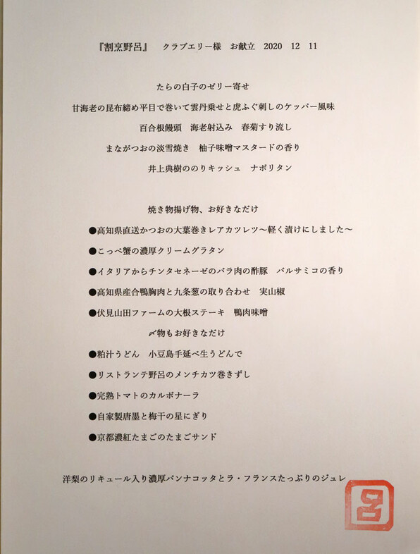 ●12月9日(水)と11日(金)に開催したクラブエリー@「リストランテ 野呂」の、クラブエリーオリジナルヴァージョン「割烹 野呂」です。