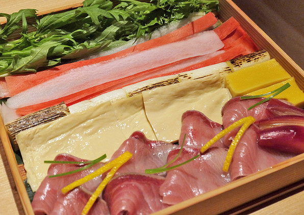 ●まぐろと冬野菜や柿や梨を積み重ねて縦に置いたものと、トマトファルシ、上にスプラウトを積み上げたのはツリーのイメージだって\(^o^)/\(^o^)/