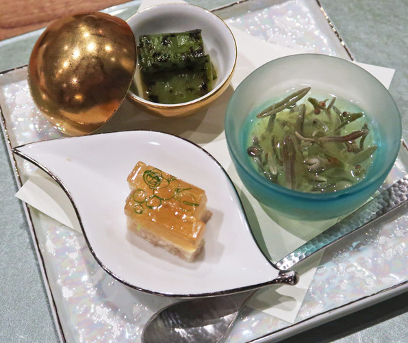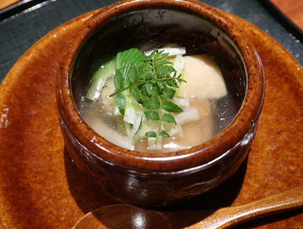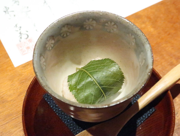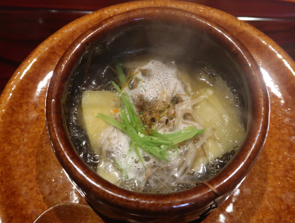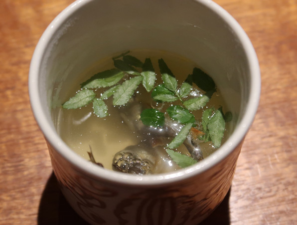 きのこと鶏のコンソメに、バターでソテしたリ・ドゥ・ヴォー、焼き茄子。おくら、針ねぎ、胡椒、ふり柚子、きのこの泡。