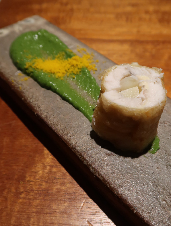 ●ときしらずの鮭をふわふわフロマージュとうすい豆ピュレで。