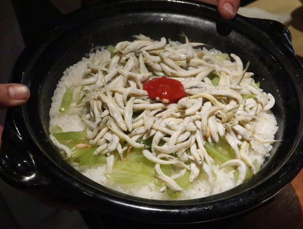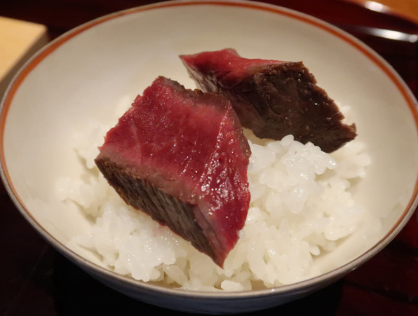 ●ごぼうご飯の上から、焼いたうなぎと甘辛くしたフォアグラをのせてプレゼン、いまだかつてなかった締めご飯です。ほぼ全員の方がおかわりして召し上がっていました。