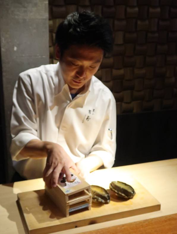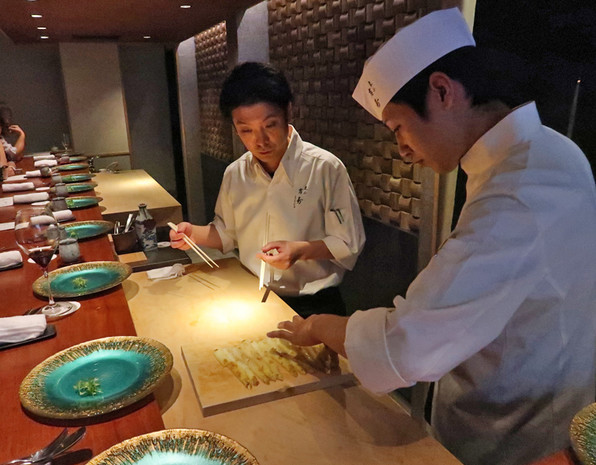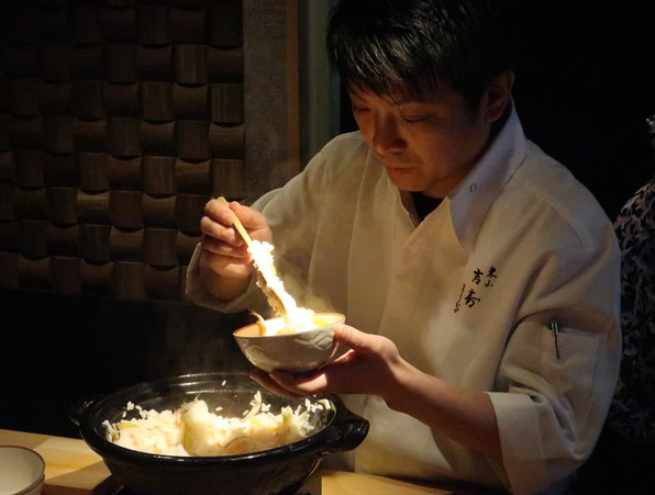 ●料理長の大河原謙治さん、うなぎフォアグラご飯をプレゼンする之図です。