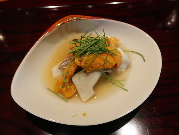 ●悶絶旨かった、いかと大根漬けの海苔巻き、上からうに山盛り。