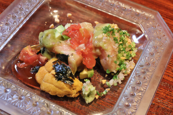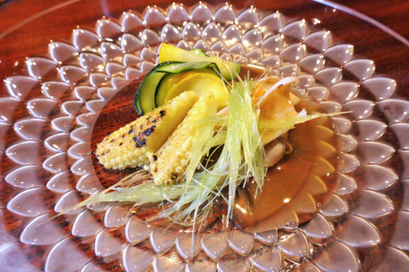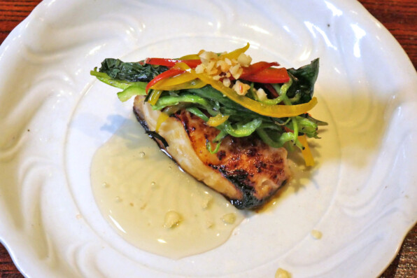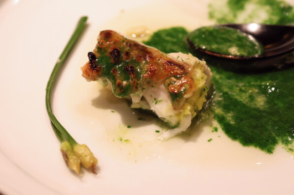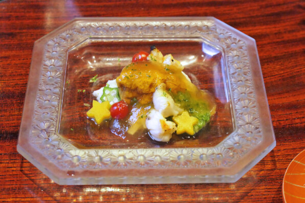 フランス料理のソースのように敷かれているのは、鰹だしの銀あんに、魚だしベースのモロヘイアあん。