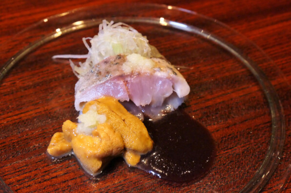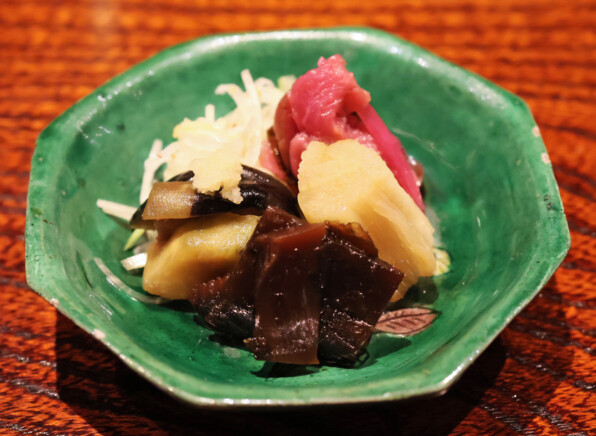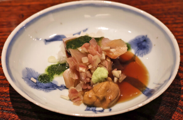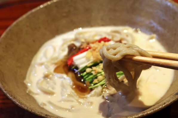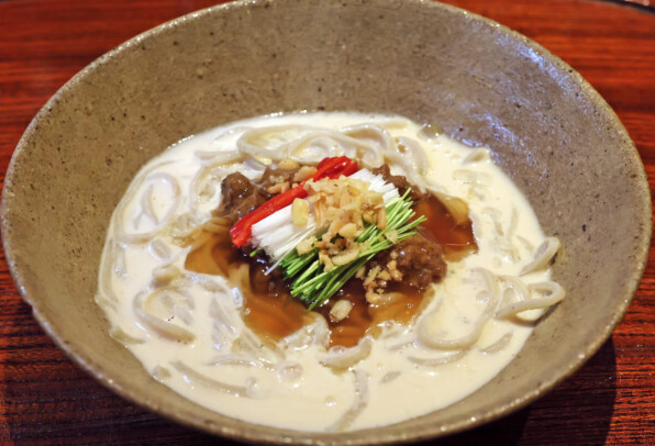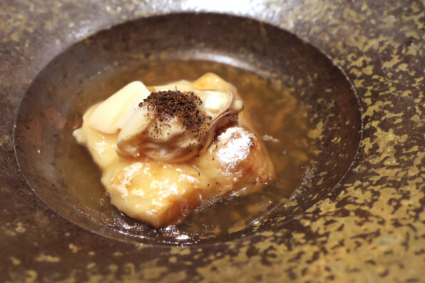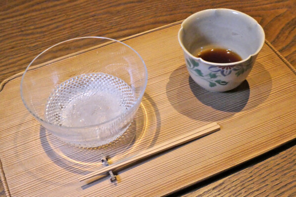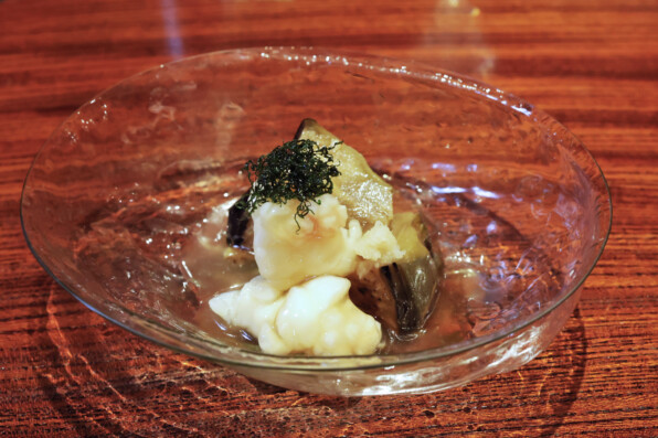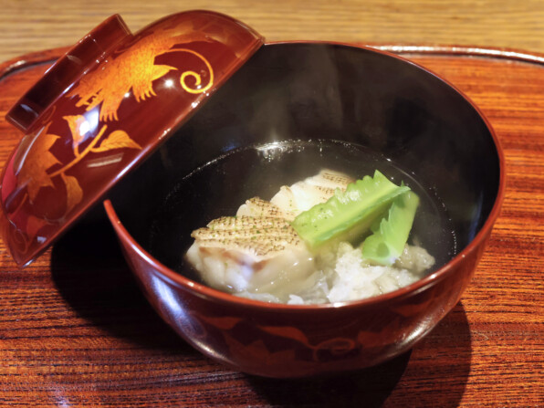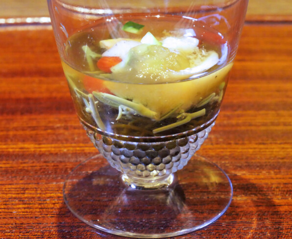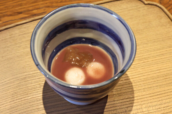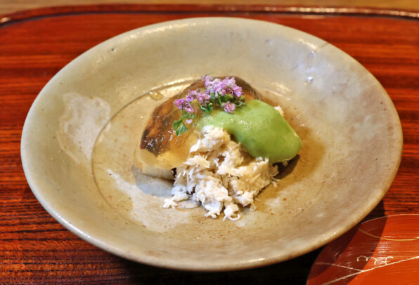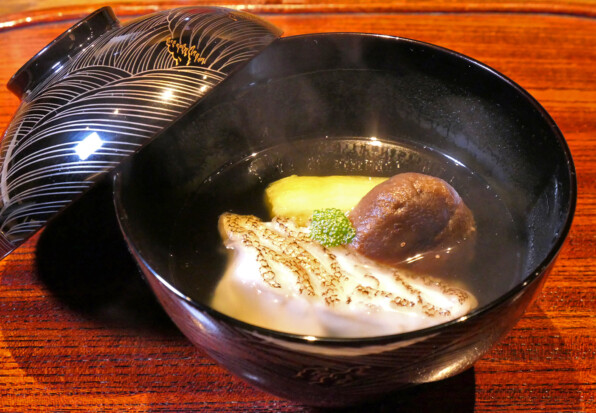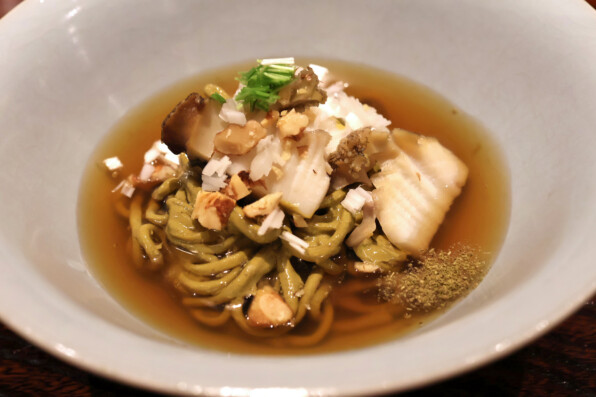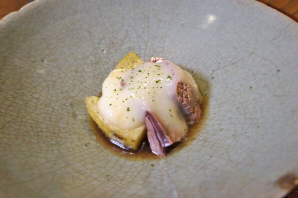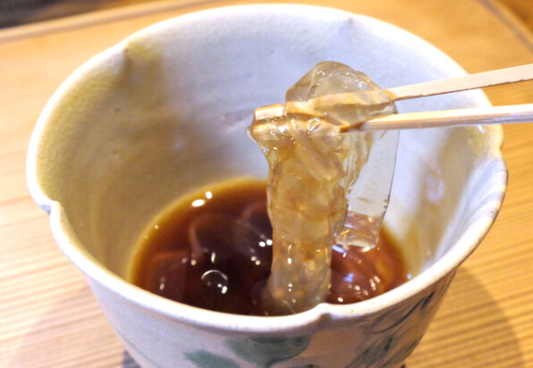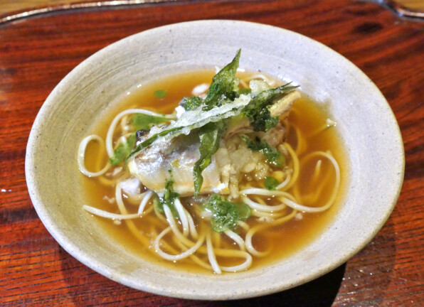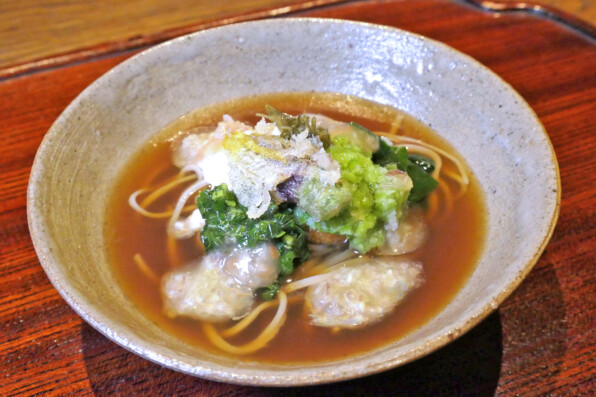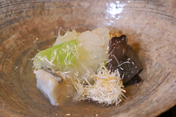 いつもより細めで、よく肝ソースがからんでいます。胡桃がとてもよいアクセントです。これだけで十分においしいのに、さらにあわび、干し椎茸、あごで取ったおだし。