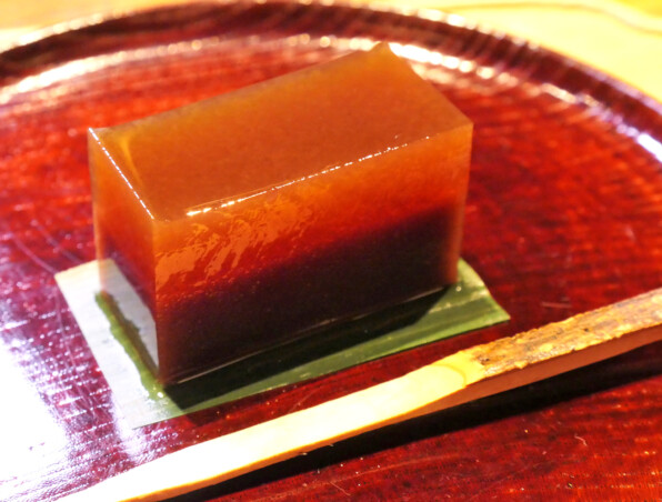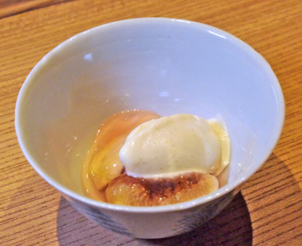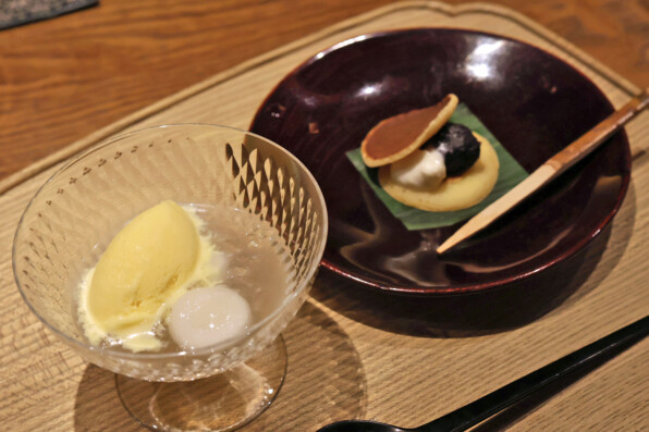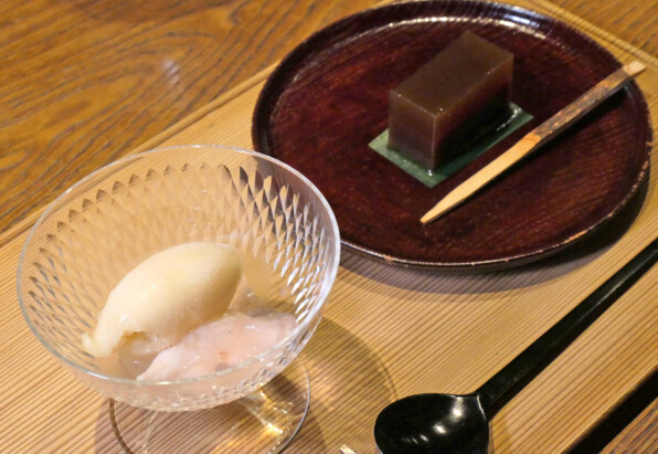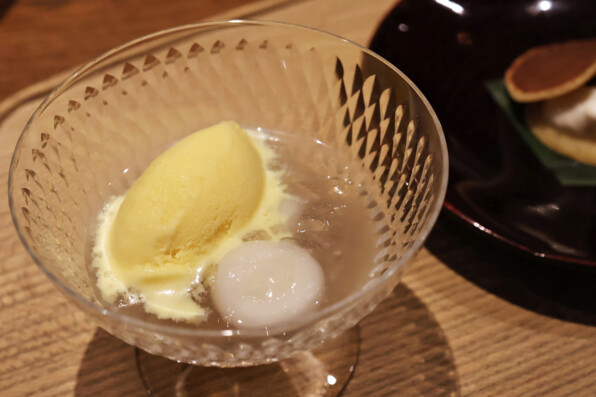 ●とうもろこし「嶽きみ」のアイスクリーム。白玉、透明のわらび餅と。白ワインゼリー。