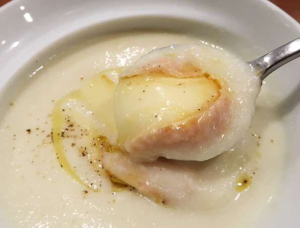 淡雪部分は、かぶら蒸しの時のかぶらの食感を思い浮かべてください。そのふわふわかぶらと卵白で淡雪仕立て、中にマスタード柚子味噌が仕込まれていて、ふわふわと同時に旨みもあり、ものすごーくおいしい。