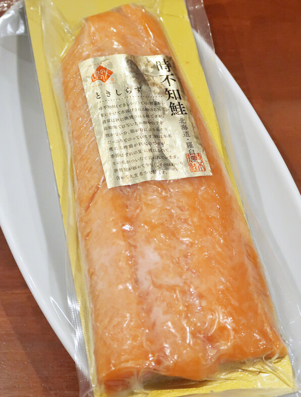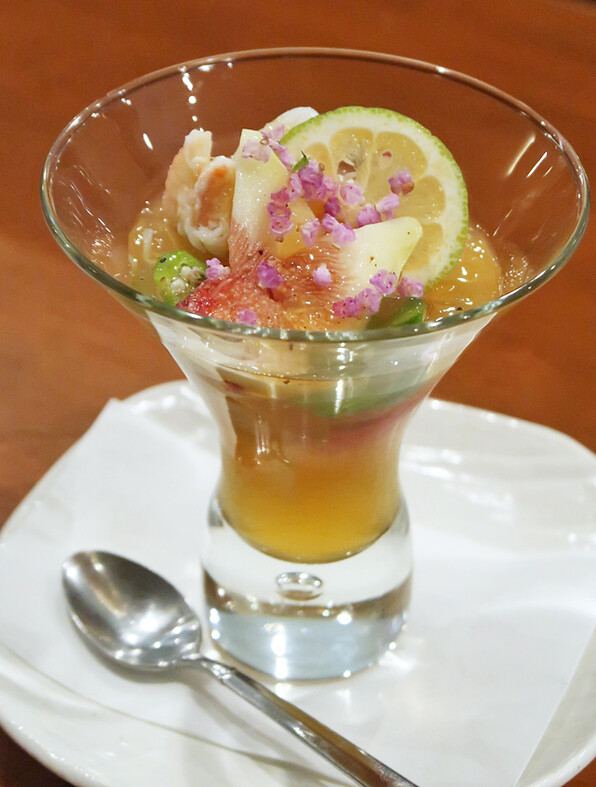 ●15日、時鮭を、ルイベで。柑橘ジュレにケイパーとドライトマト。下にいちじく。