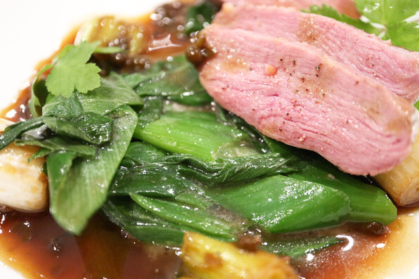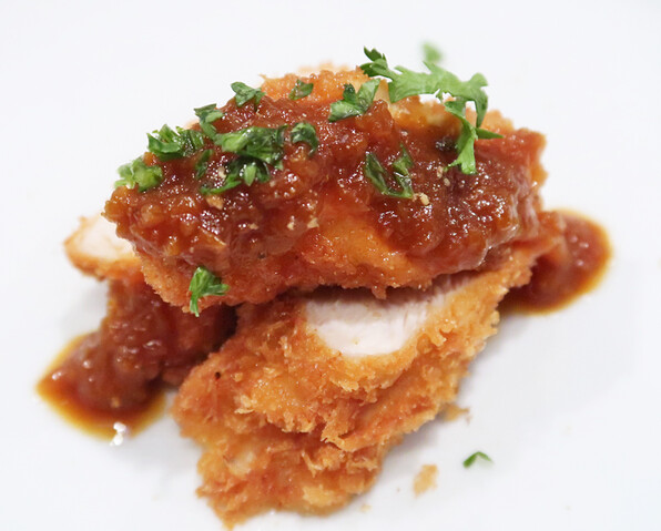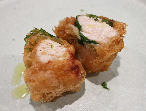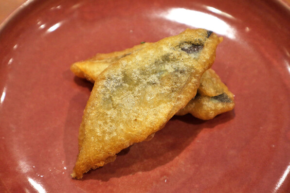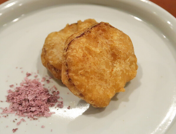 ●上に出した、紫ずきんのフリットと胡麻香味ソースをかけたトマト。