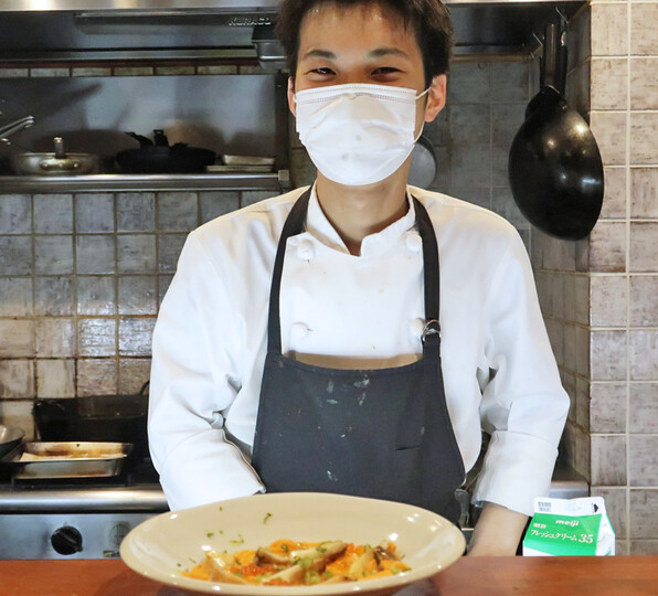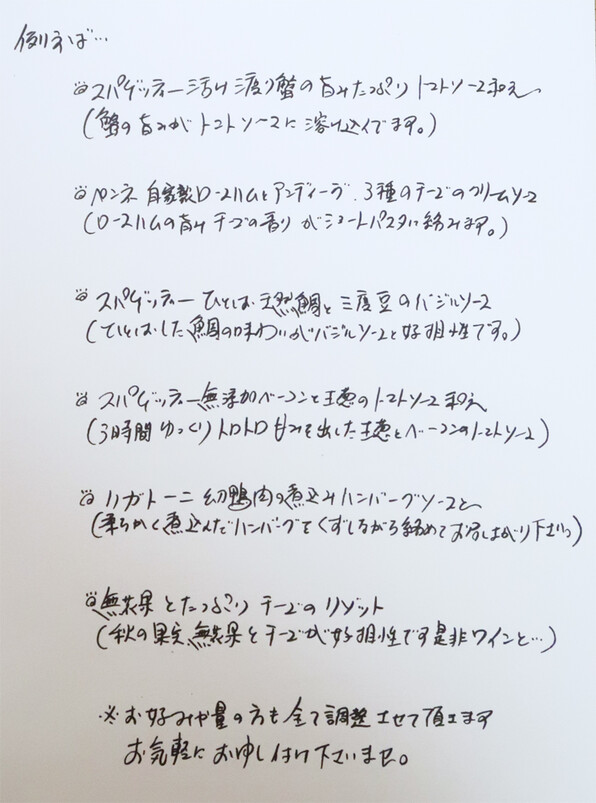 ●裏にパスタやリゾットのメニュー例がありますが、ここに書いてないものでも、食材さえあれば何でもやってくださいます。