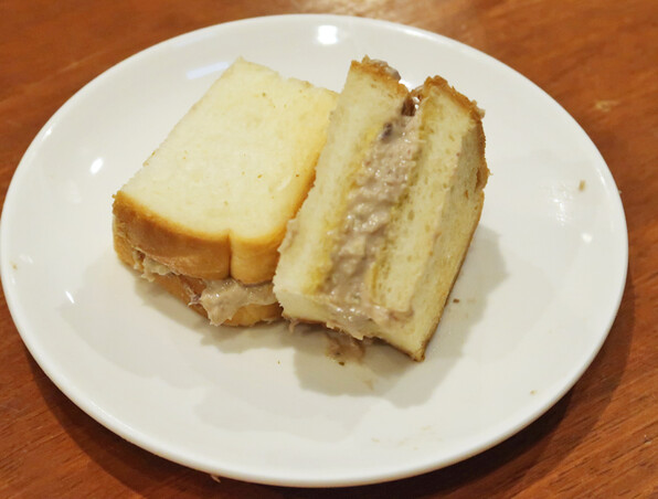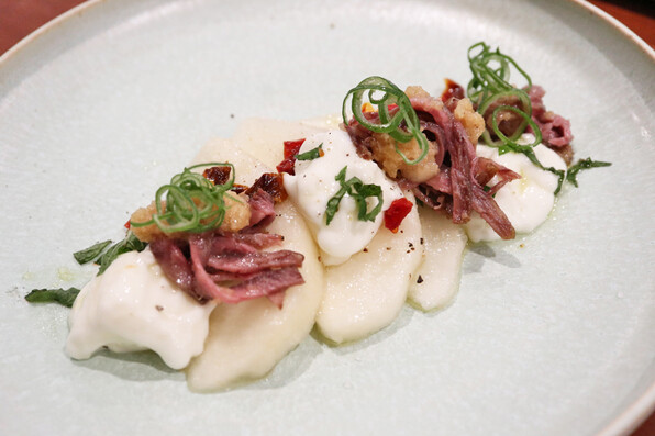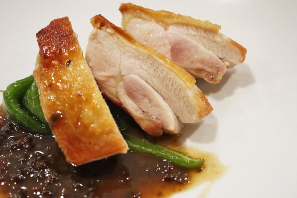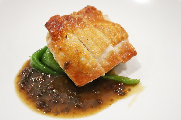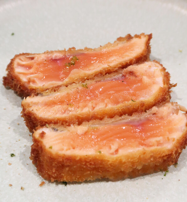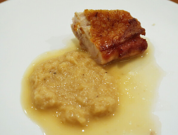 ●紫ずきんと蟹のクリームコロッケ、とろとろしたクリームコロッケに豆がたっぷり入って食感もよいです。魚のスープが旨みを与えてたまらなく美味です。