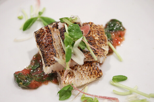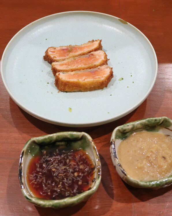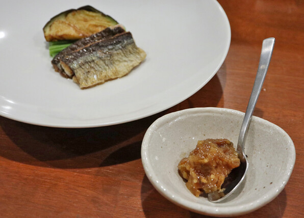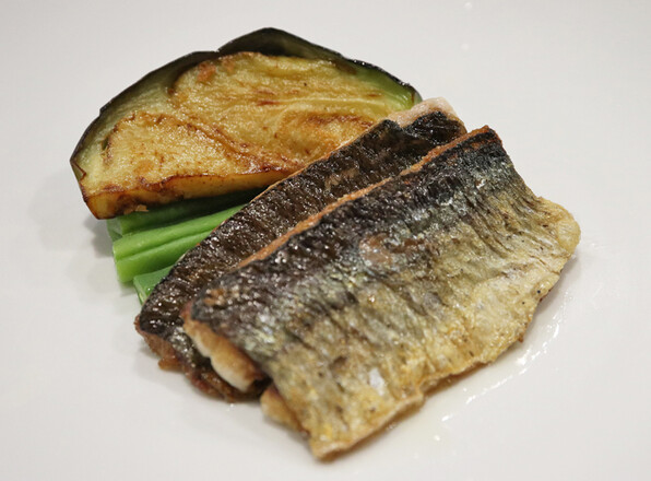●13日、時鮭を、ミ・キュイで、バジルソースとトマトソースで。間に賀茂茄子。